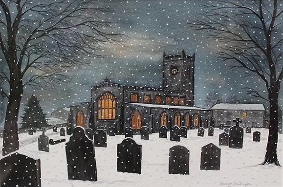 - 28. Askrigg Church with snow falling 25 x 35.5 cm WATERCOLOUR Reserve £150