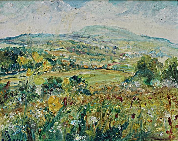 - 40. Summer Haze, Penhill with buttercups: Old Glebe field, Wensleydale 34.5 x 45 cm OIL reserve £150