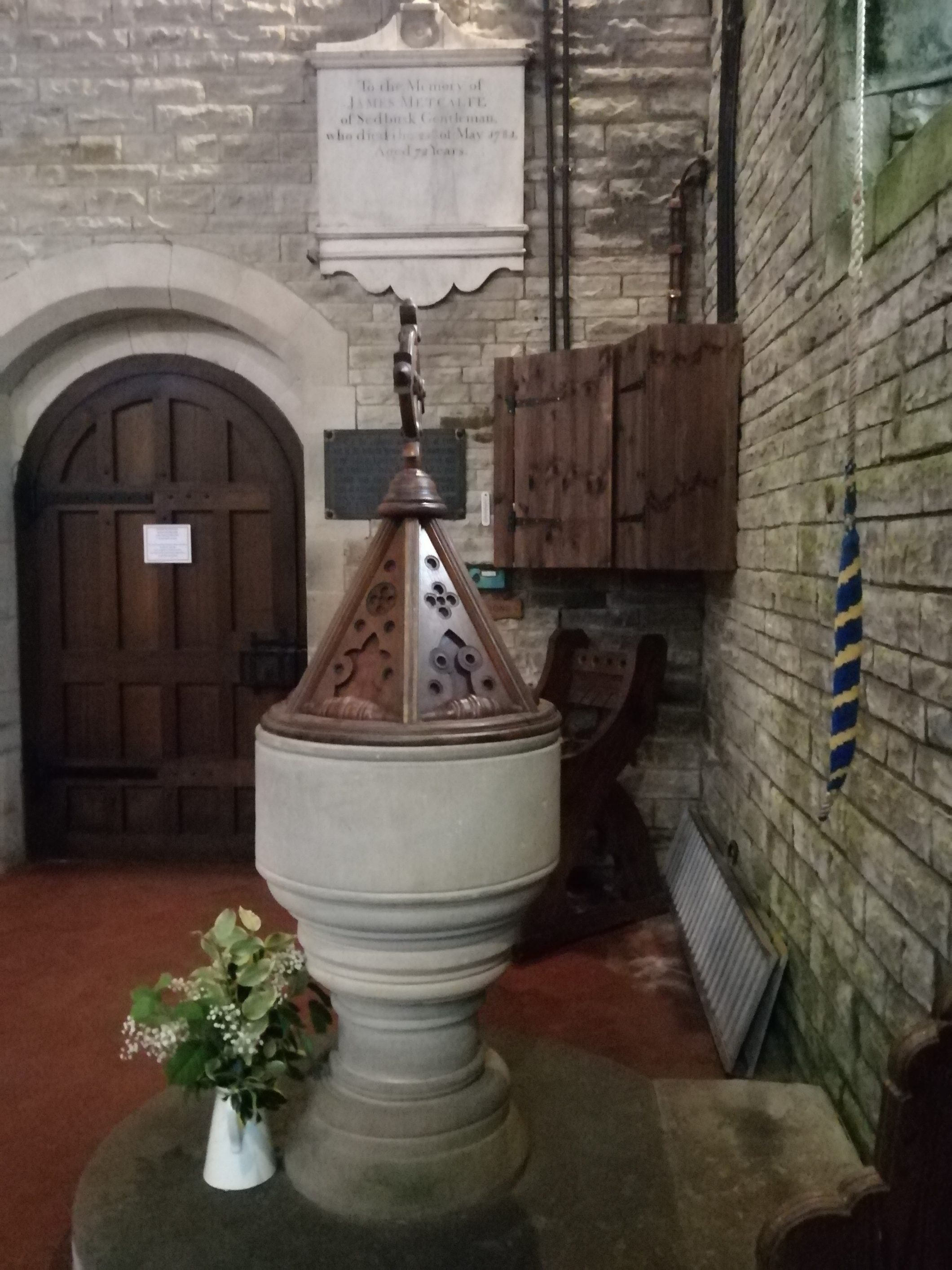 The church is built of simple dressed stone with a stone flagged roof. The chancel and central isle in the naïve are flagged and clear glass in the windows let in a good light. The stained glass windows on the South side of the Chancel are beautiful with the sun shimmering through. They were provided by the Rev Robert Pinck who was vicar of Hardraw for 59 years, dying in 1913. One window celebrates his first 25 years at the church and the other is a memorial to his eldest son who was drowned whilst at Sedburgh School.