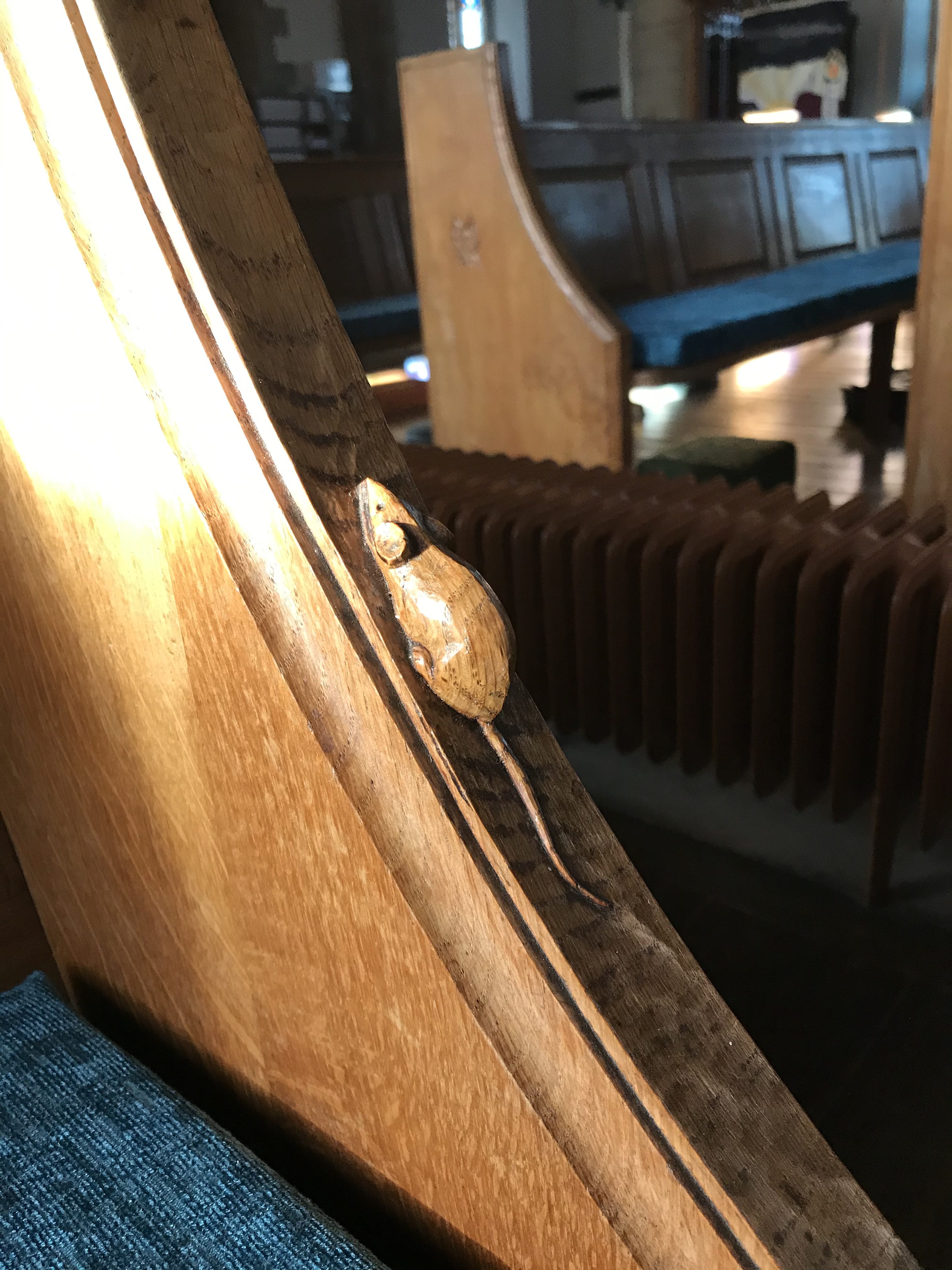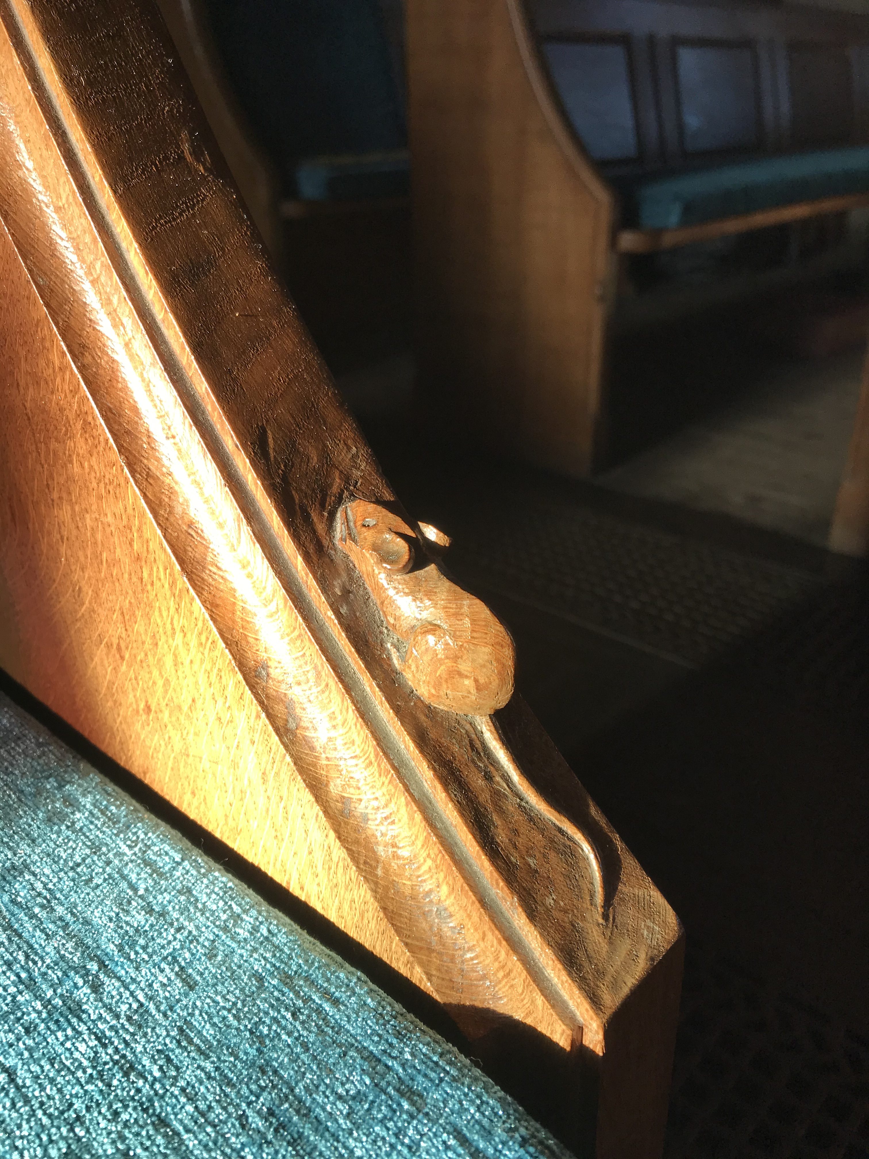 The main body of the church contains some of its finest features – the superb oak furniture which, during the long incumbency of Canon Grice-Hill gradually replaced the original Victorian pitch-pine pews. It is all in hand-carved English oak, oak-pinned (not screwed) together, and most of it is either by Thompson, the famous ‘Mouseman’ of Kilburn – so called because his trade-mark was the tiny mouse he carved into all his work – or by his one time apprentice Lyndon Hammel of Harmby (whose own mark is a cat that has caught a mouse). Robert Thompson was a late disciple of the Arts and Craft movement which advocated a return to traditional methods and materials, and even where the work is not by him or Hammel, it is in the same tradition. A careful scrutiny will reveal a wealth of delightful small carvings depicting the flora and fauna of the Dales, Christian symbols, and even the traditional Green Man (he isn’t immediately obvious). Since each panel has the name of its donors carved into it, few of whom were wealthy people, the whole forms an eloquent tribute to the many who worshipped here during the twentieth century. It is questionable whether any church has a finer collection of the Thompson school’s superb craftsmanship than can’ be seen here. Moreover, the pews are quite comfortable to sit in especially with the recently refurbished cushions – a rare boom!